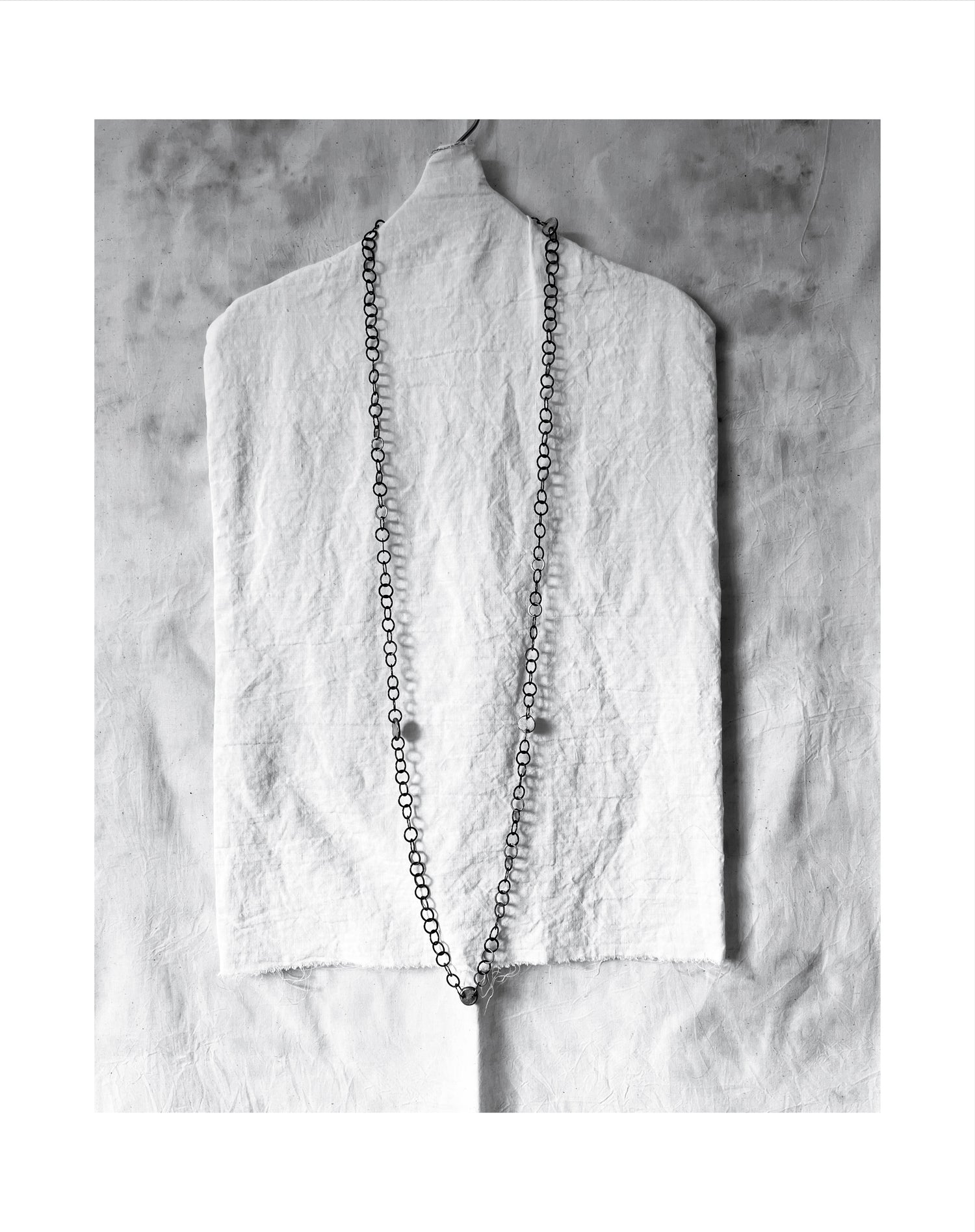 Handcrafted link by link, this long oxidised chain is a celebration of texture and movement. Solid, organically shaped discs create subtle rhythm and individuality throughout the piece, making this chain truly one of a kind.