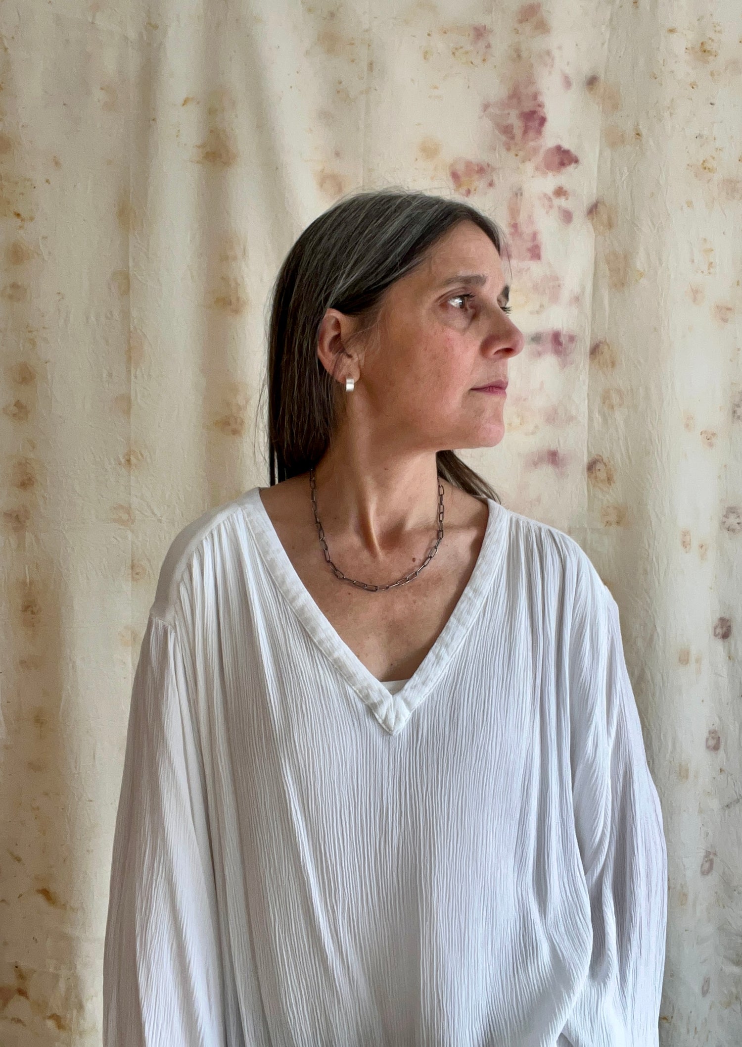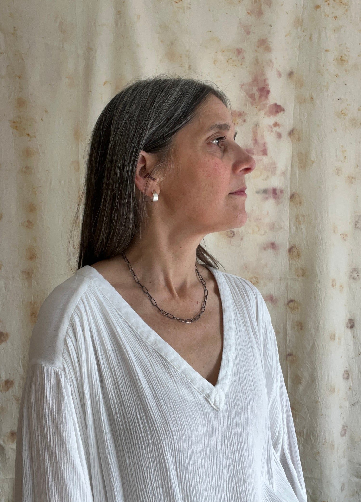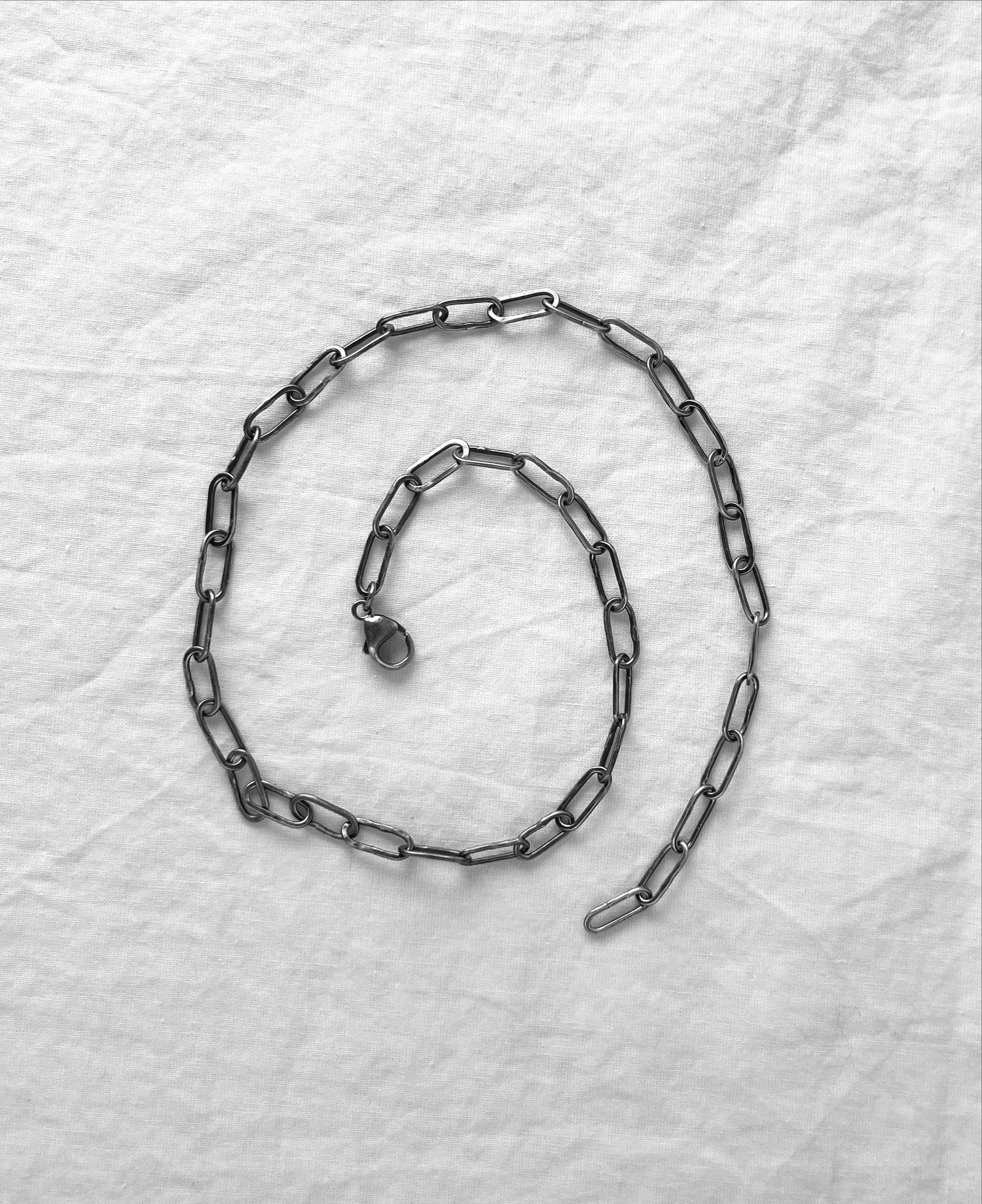 This minimalist chain is entirely handmade, link by link, with each link hammered flat to create a subtle, textured surface. Delicate yet bold, it’s a versatile piece that pairs beautifully with any style—perfect worn on its own or layered with your favourite chains. Finished with an oxidised patina, it has a timeless character that makes it a go-to everyday accessory.