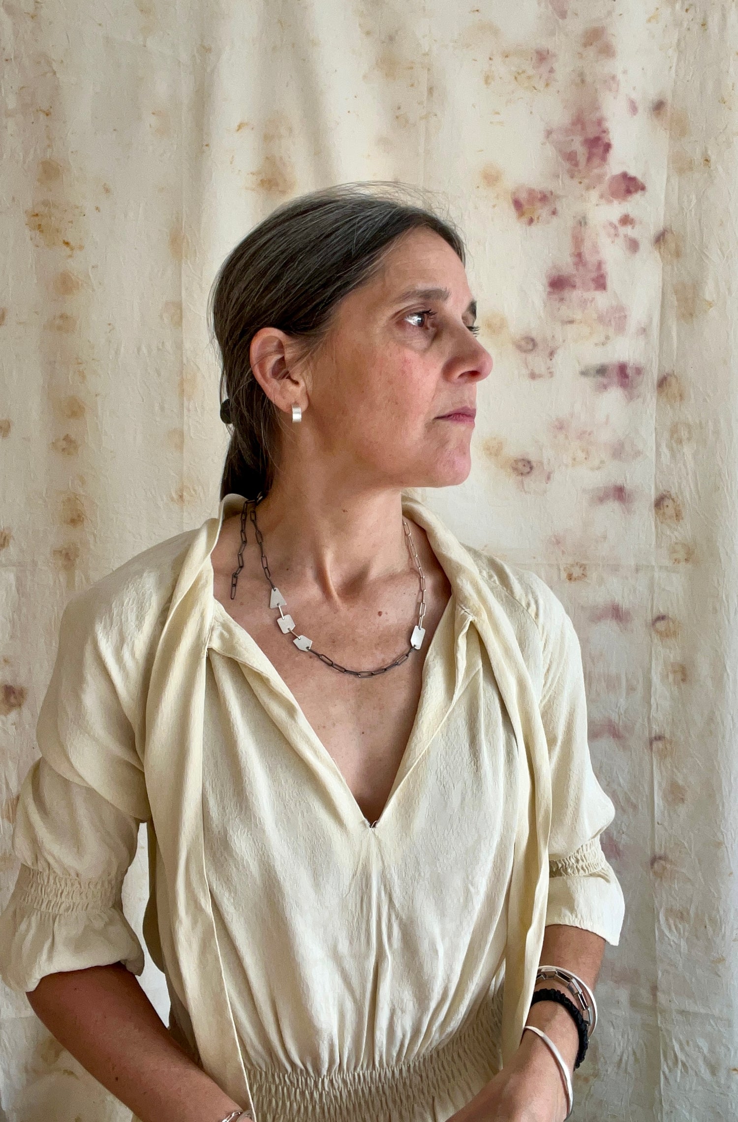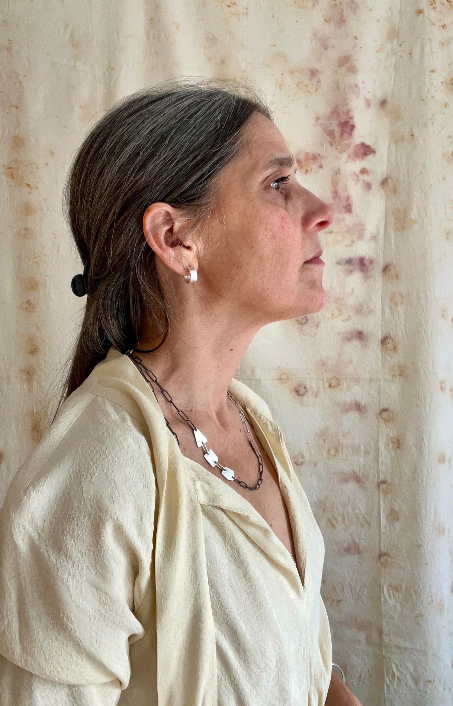 This unique chain is formed and shaped by hand, from recycled sterling silver. To one side, I’ve added three organically shaped silver sheet details, balanced by a single piece on the opposite side for harmony and intrigue. The chain shifts in finish from satin polish at one end to a rich oxidised patina, while each silver sheet element is left in a soft satin finish. This play of light and contrast makes the chain dynamic and truly one of a kind.